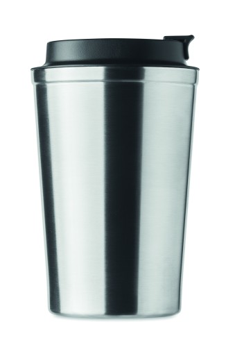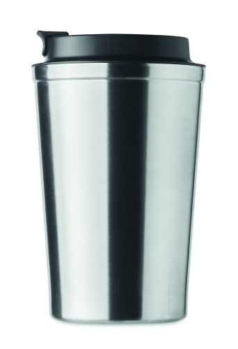Double wall stainless steel tumbler with PP lid. Capacity: 350 ml. Leak free.