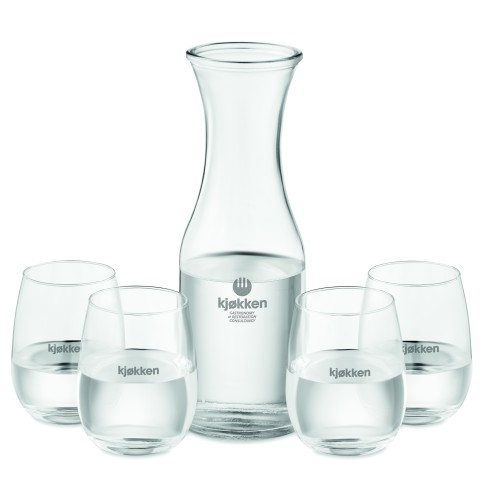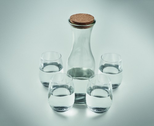 Recycled glass drink set. Including: Carafe (1L) with cork lid and 4 glasses (420 ml). Cork is 100% natural material. Due to its structural nature and surface porosity the final print result per item may have deviations.