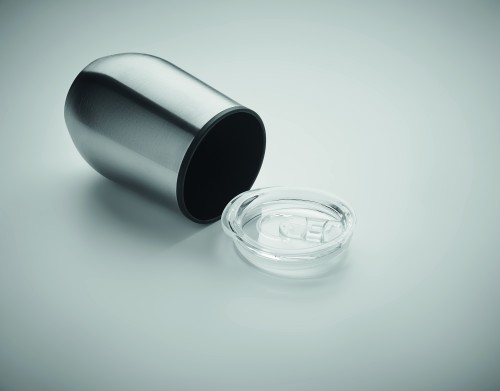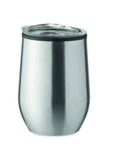 Double wall stainless steel cup with inner PP and transparent PS lid. Capacity: 350 ml.