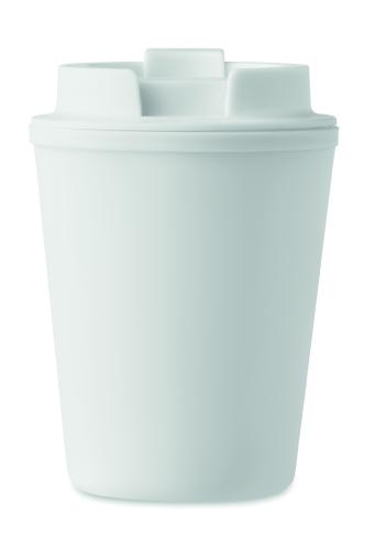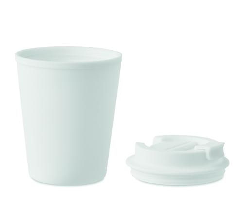 Double wall tumbler in PP. Capacity: 300 ml. Leak-free.
