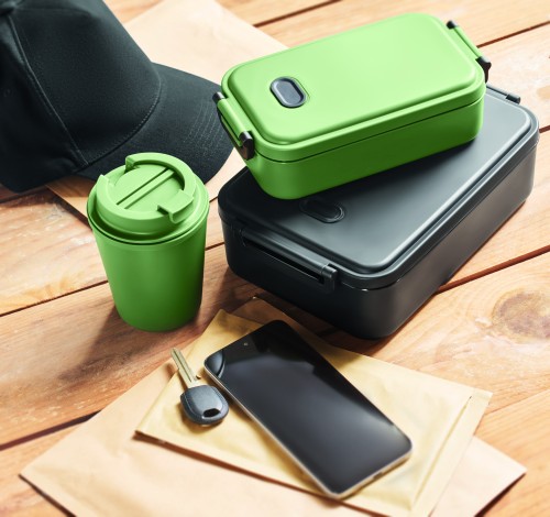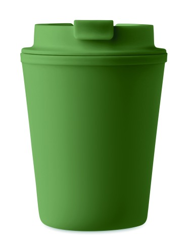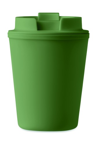 Double wall tumbler in PP. Capacity: 300 ml. Leak-free.