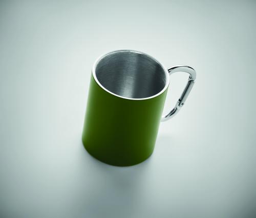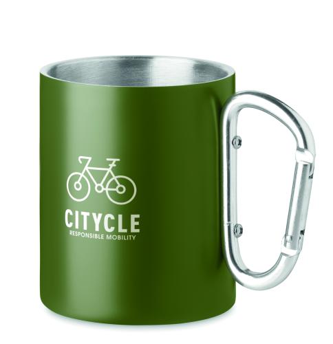 Double wall stainless steel mug, with carabiner handle. Capacity: 300 ml.
