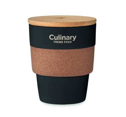 Single wall tumbler in PP with cork protective sleeve and bamboo lid. Capacity: 300 ml. As this is a single walled mug heat transfer can still occur. Bamboo is a natural product, there may be slight variations in colour and size per item, which can affect the final decoration outcome.