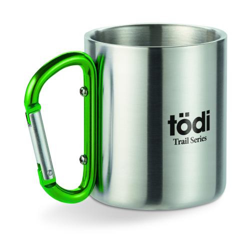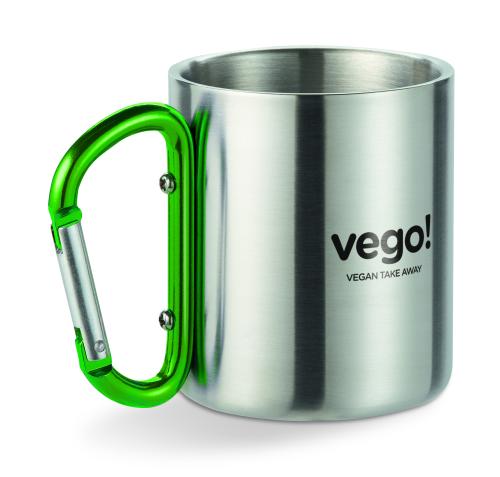 Double wall stainless steel mug, with carabiner handle. Capacity: 220 ml.