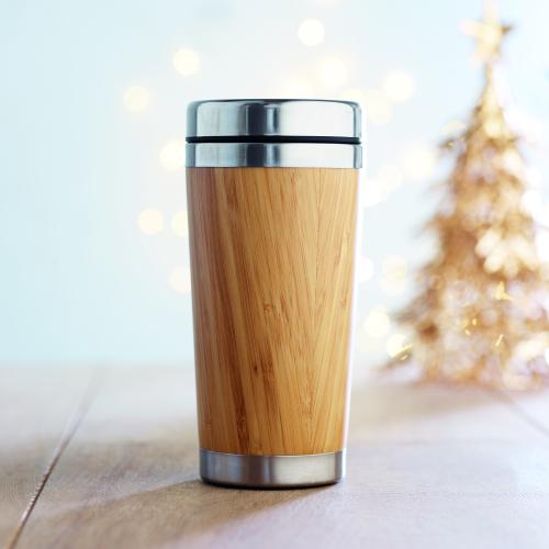 Double wall stainless steel flask with bamboo cover and PP lid. Capacity: 400 ml. Bamboo is a natural product, there may be slight variations in colour and size per item, which can affect the final decoration outcome.