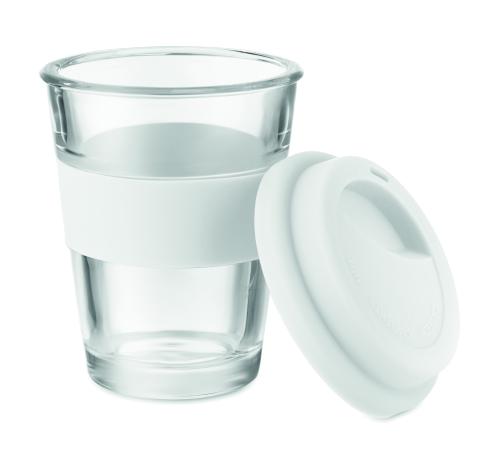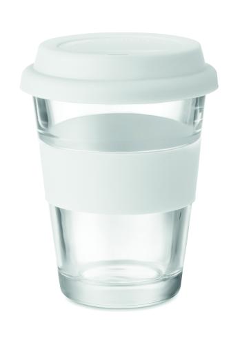 Glass tumbler with silicone lid and grip. Capacity 350 ml. As this is a single wall mug heat transfer can still occur.
