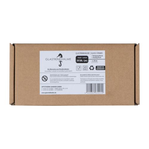 Reusable and tempered glass drinking straw with 20 cm length. This item comes in a box with 50 pieces including a cleaning brush. Dishwasher safe.