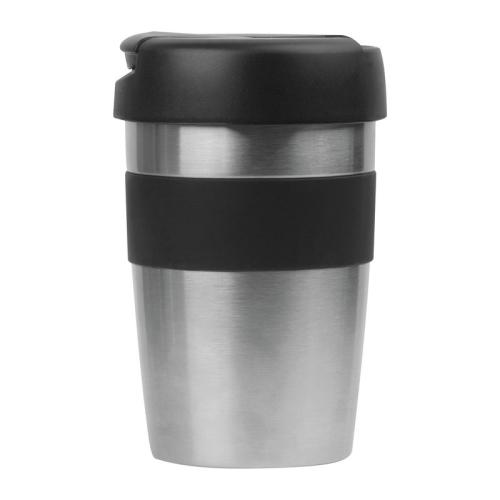 Metal, leak-proof insulating mug with 300 ml capacity, lid lock, and rubberized grip zone.