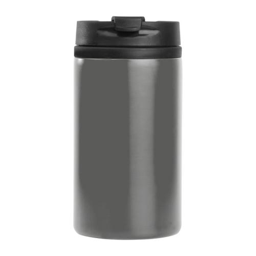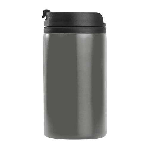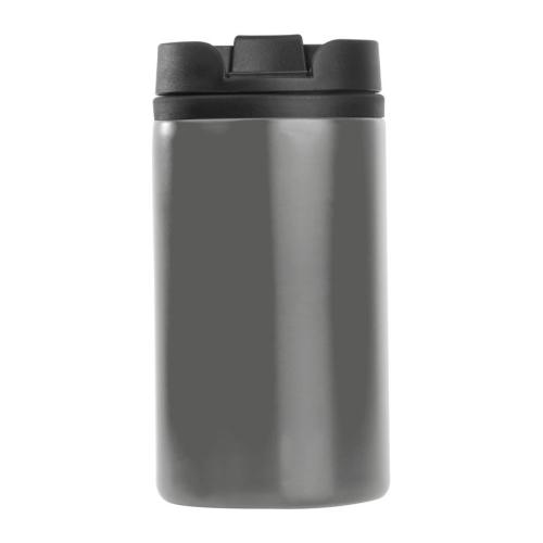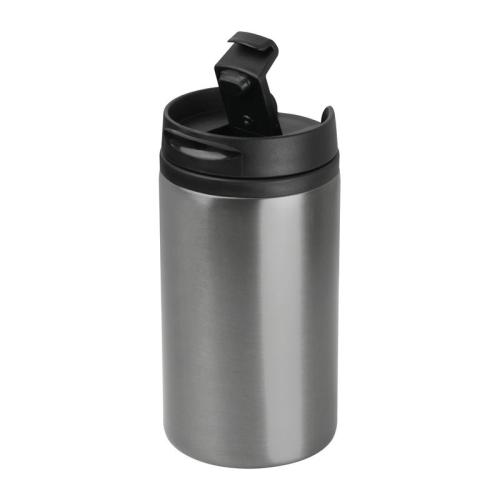 Double-walled drinking cup made of metal with drinking sliding bar in a screw cap and 250 ml capacity.