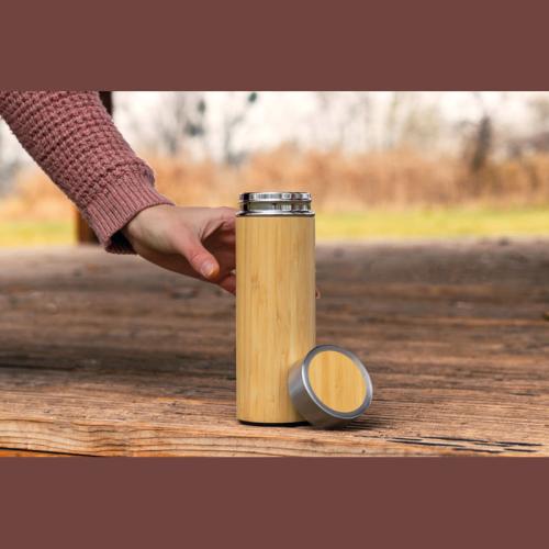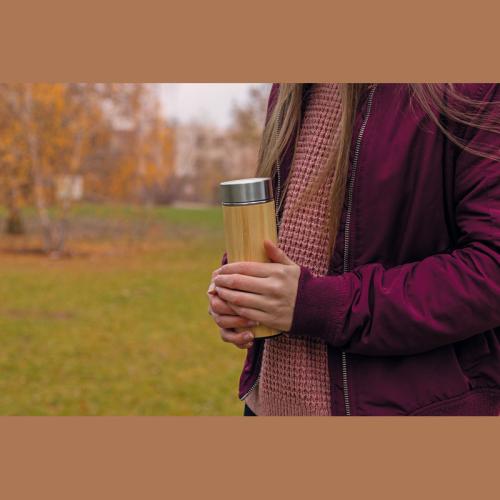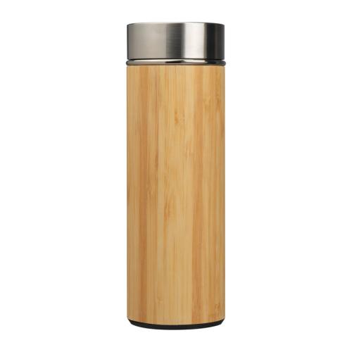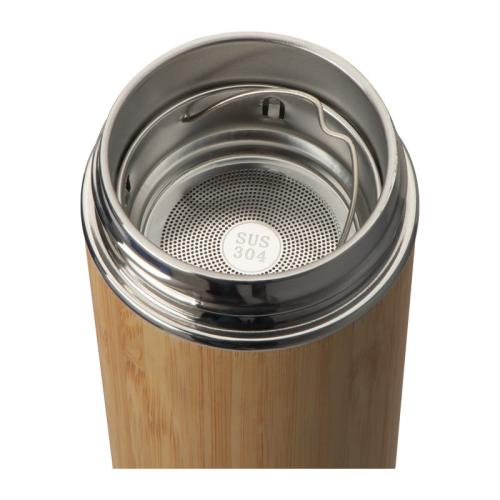 Drinking cup made of stainless steel with a bamboo coating and tea strainer, capacity of 350ml.