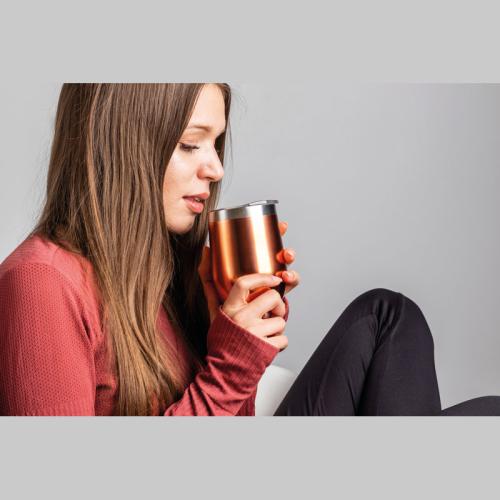 Double-walled, vacuum drinking cup, made of stainless steel, with a capacity of 300 ml and a transparent drinking cap.