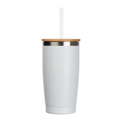 Stainless steel to-go cup with vacuum insulation, bamboo lid and sturdy plastic straw.