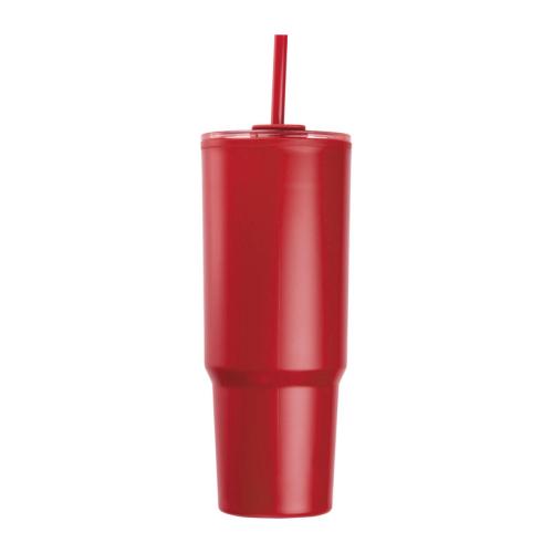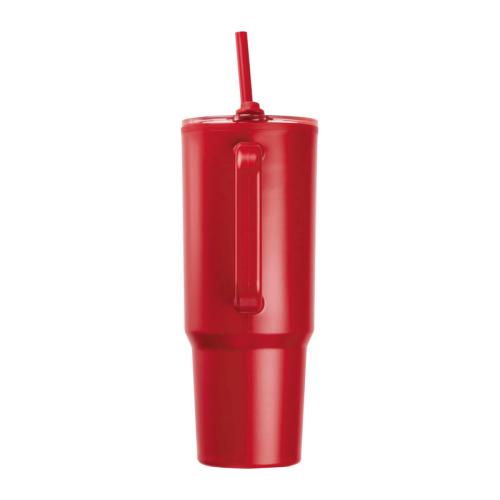 Double-walled XXL plastic drinking cup with a capacity of 1200ml, practical carrying handle and removable straw in the lid.