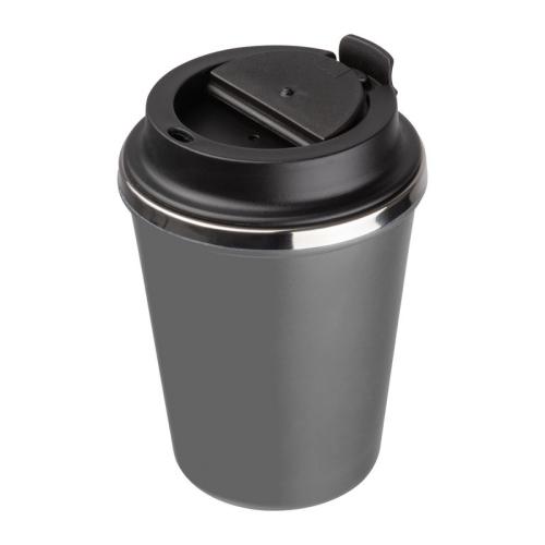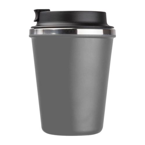 Double-walled drinking cup with a stainless steel interior and a recycled plastic exterior. Filling capacity of 350ml and a leak-proof screw cap with lockable drinking opening.