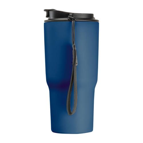 Elegant double-walled vacuum drinking cup made of stainless steel with a capacity of 550ml, a leak-proof screw cap and drinking opening as well as a practical carrying strap.
