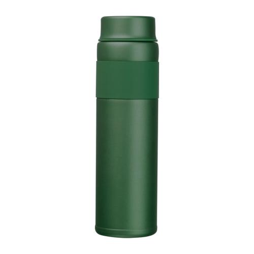 Double-walled vacuum stainless steel bottle with 600ml capacity. Ergonomically designed with a color-coordinated PU band for a comfortable grip.