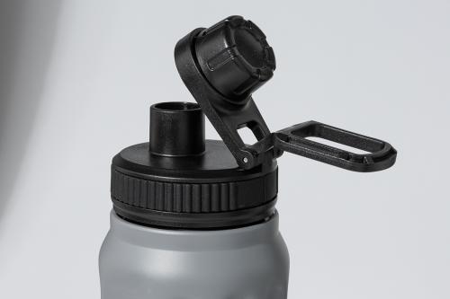 Double-wall, recycled stainless steel vacuum insulated bottle with vertical grooves. Features a PP drinking lid with integrated carry handle. 540 ml.