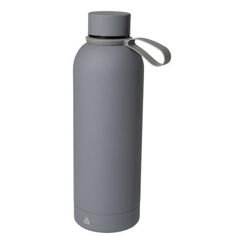 Double-wall, recycled stainless steel vacuum insulated bottle with rubberized finish and silicone carry handle, 500 ml.