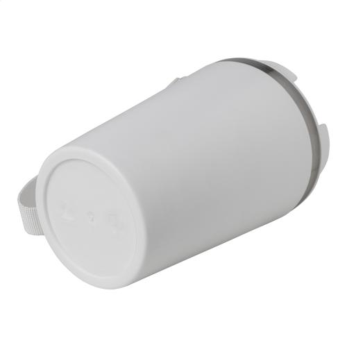 Double-wall, recycled stainless steel insulated thermo cup with PP plastic outside and drinking lid. With RPET carry strap. 350 ml.