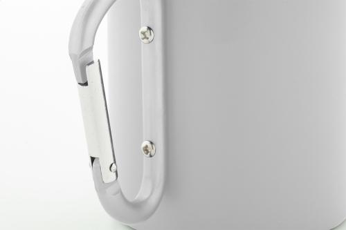 Double-wall, recycled stainless steel thermo mug with matching colour recycled aluminium carabiner handle. 300 ml. In kraft paper box.