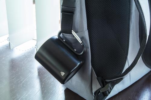 Double-wall, recycled stainless steel thermo mug with matching colour recycled aluminium carabiner handle. 300 ml. In kraft paper box.