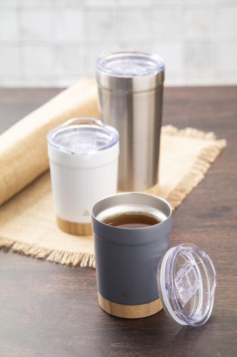 Double-wall, recycled stainless steel vacuum insulated thermo cup with bamboo base and AS plastic drinking lid. 300 ml.