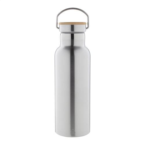 Double-wall, recycled stainless steel vacuum insulated bottle with bamboo carry lid. 500 ml.