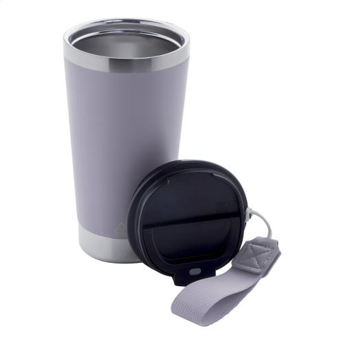Double-wall, recycled stainless steel insulated thermo cup with PP drinking lid and matching colour carrying strap. 430 ml.