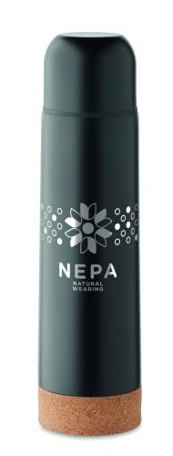 Double wall vacuum insulated flask in recycled stainless steel (90% recycled stainless and 10% stainless steel) with cork detail base. Leak- free. Capacity: 500 ml.