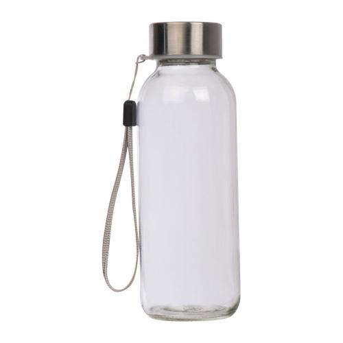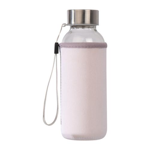 Transparent drinking bottle made of glass, with neoprene sleeve, closing lid, carrying strap, and 300 ml capacity.