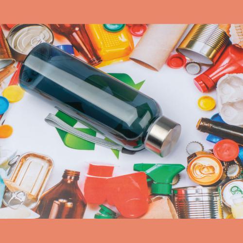 PET drinking bottle with stainless steel lid, hand loop and a capacity of 500 ml.