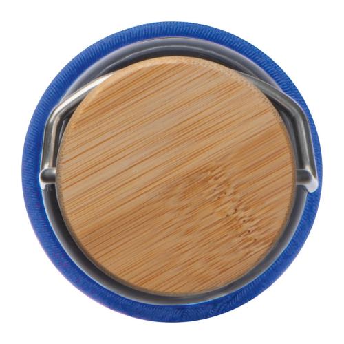 Glass drinking bottle with neoprene sleeve, stainless steel lid with bamboo top, carrying handle and a capacity of 600 ml.