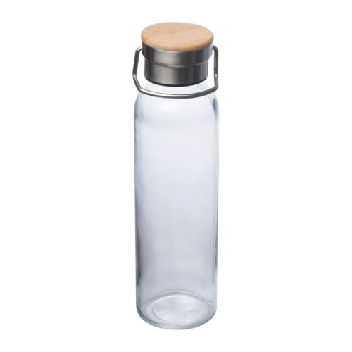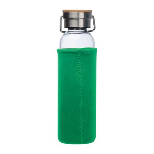 Glass drinking bottle with neoprene sleeve, stainless steel lid with bamboo top, carrying handle and a capacity of 600 ml.