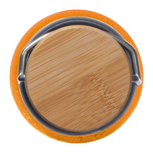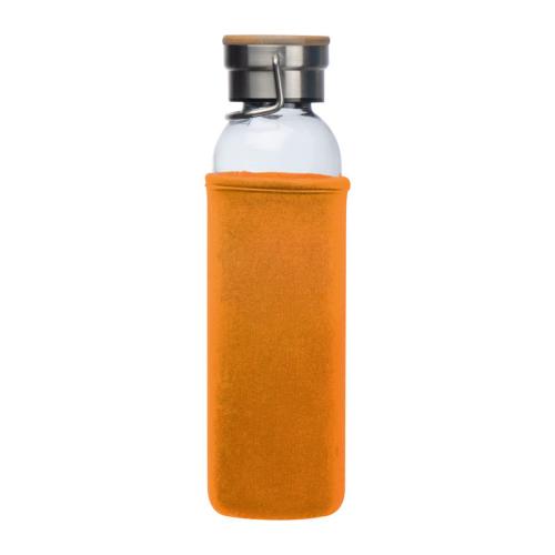 Glass drinking bottle with neoprene sleeve, stainless steel lid with bamboo top, carrying handle and a capacity of 600 ml.
