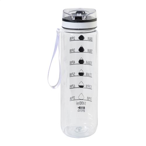 Frosted RPET sport bottle with motivational volume and time markings, featuring an auto-open flip-top drinking lid with safety lock and carry strap. 1000 ml. BPA-free. Not suitable for carbonated drinks.