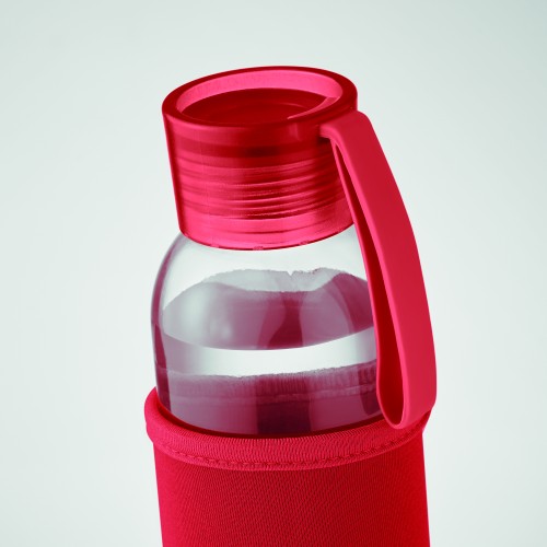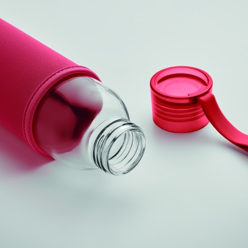 Recycled glass bottle with neoprene pouch and PP lid with silicone hanger. Leak free. Capacity: 500 ml.