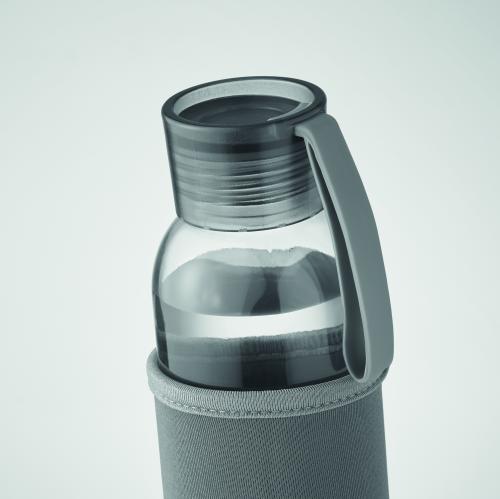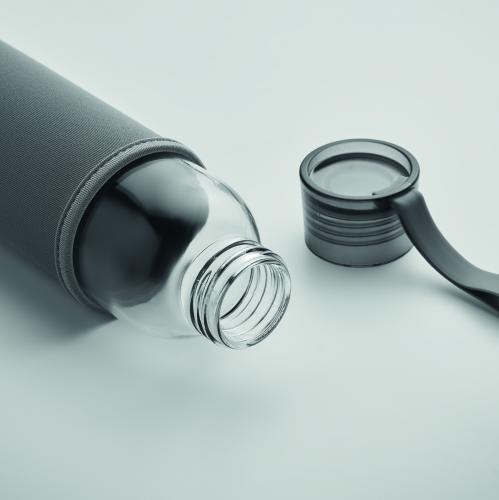 Recycled glass bottle with neoprene pouch and PP lid with silicone hanger. Leak free. Capacity: 500 ml.