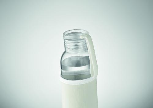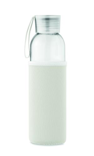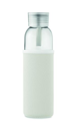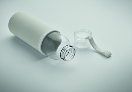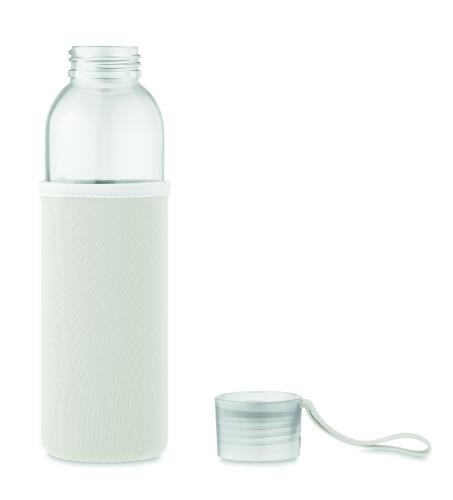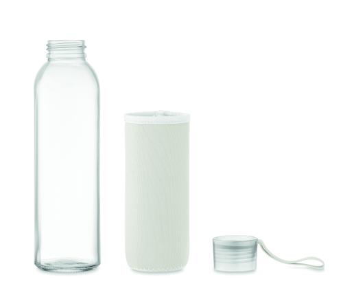 Recycled glass bottle with neoprene pouch and PP lid with silicone hanger. Leak free. Capacity: 500 ml.