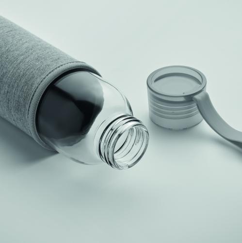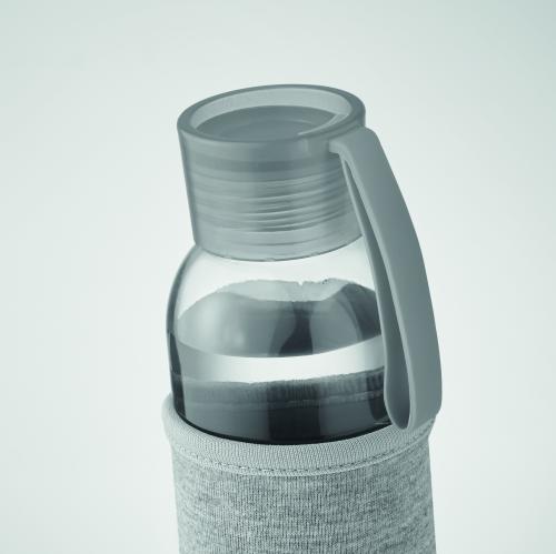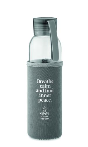 Recycled glass bottle with neoprene pouch and PP lid with silicone hanger. Leak free. Capacity: 500 ml.