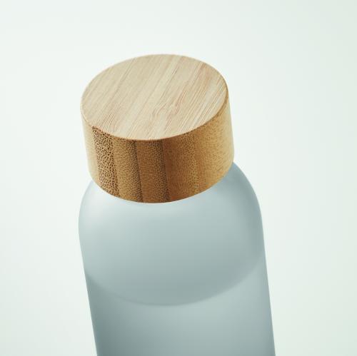 Glass bottle with frosted finish and bamboo lid. Leak-free. Capacity: 500 ml. Bamboo is a natural product, there may be slight variations in colour and size per item, which can affect the final decoration outcome.
