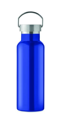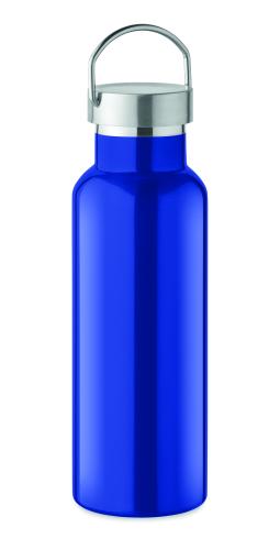 Double wall insulating vacuum bottle in recycled stainless steel (90 % recycled stainless steel and 10% stainless steel) with lid with handle. Capacity: 500 ml.