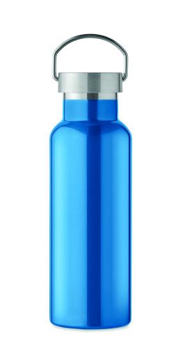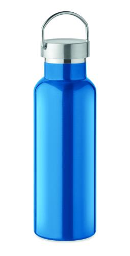 Double wall insulating vacuum bottle in recycled stainless steel (90 % recycled stainless steel and 10% stainless steel) with lid with handle. Capacity: 500 ml.