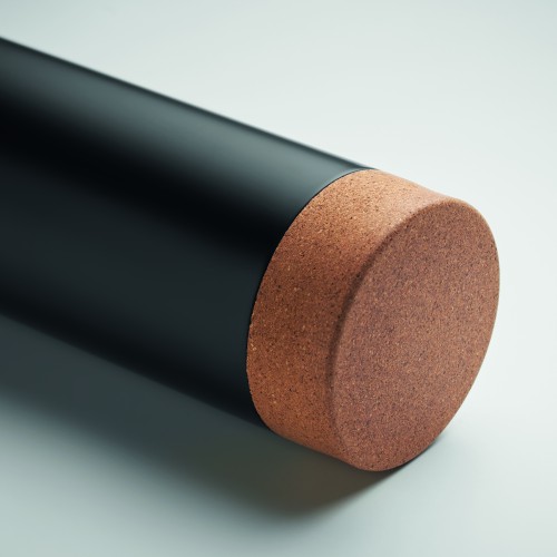 Double wall vacuum insulated flask in recycled stainless steel, the lid has a carry handle and a cork detail base (90% recycled stainless and 10% stainless steel). Leak-free. Capacity: 500 ml.
