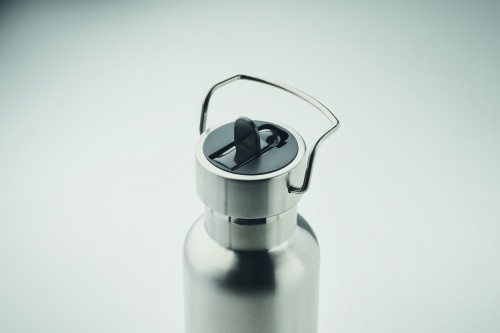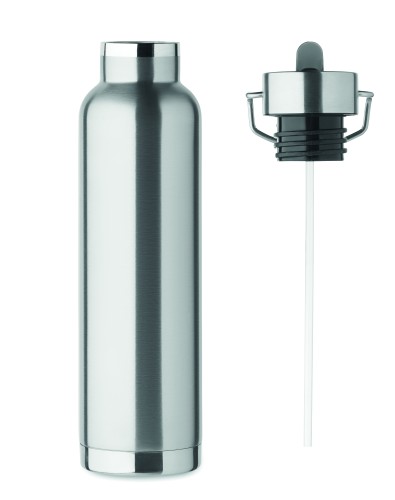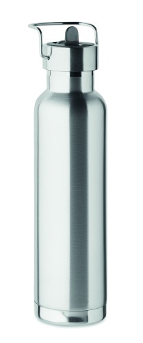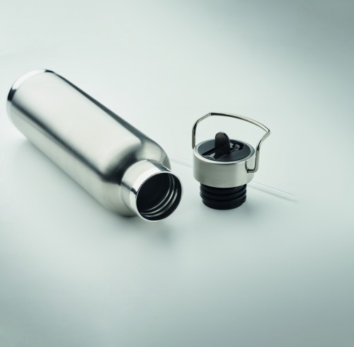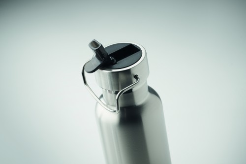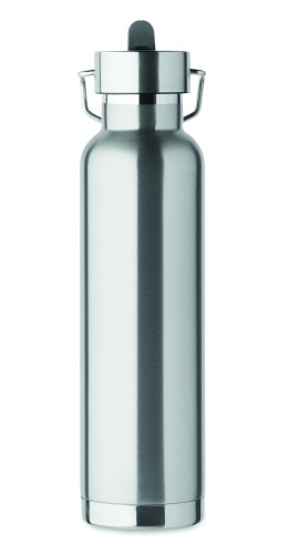 Double wall vacuum insulating bottle in recycled stainless steel (90% recycled stainless steel and 10% stainless steel) with built-in straw and handle lid. Capacity: 660 ml.
