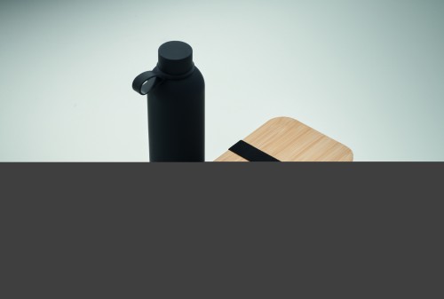 2 piece lunch gift set, including double wall vacuum insulating bottle in recycled stainless steel (90% recycled stainless steel and 10% stainless steel) and PP lunch box with bamboo lid and RPET elastic band. Leak-free. Capacity 500ml and 900ml.