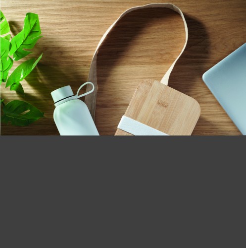 2 piece lunch gift set, including double wall vacuum insulating bottle in recycled stainless steel (90% recycled stainless steel and 10% stainless steel) and PP lunch box with bamboo lid and RPET elastic band. Leak-free. Capacity 500ml and 900ml.