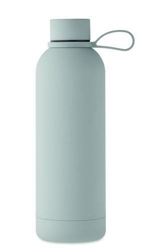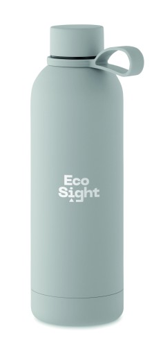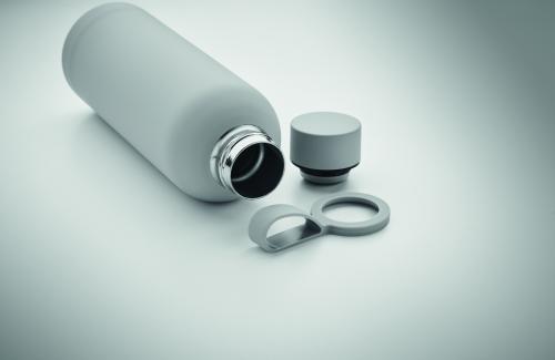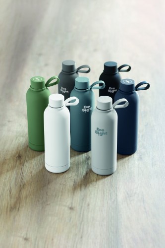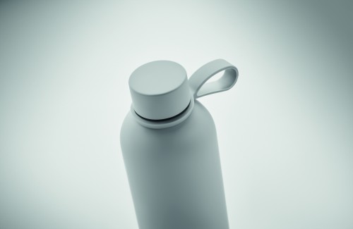Double wall vacuum insulating bottle in recycled stainless steel (90% recycled stainless steel and 10% stainless steel) with rubber finish and silicone handle. Capacity: 500 ml.