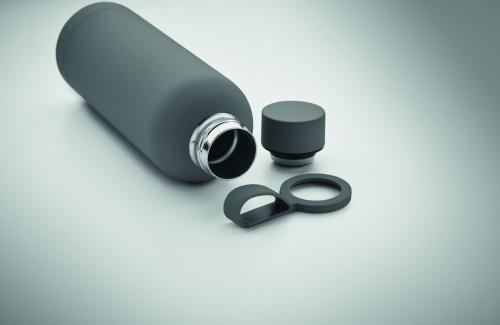 Double wall vacuum insulating bottle in recycled stainless steel (90% recycled stainless steel and 10% stainless steel) with rubber finish and silicone handle. Capacity: 500 ml.