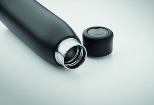 Double wall recycled stainless steel (90% recycled stainless steel and 10% stainless steel) bottle with soft silicone carry ring lid. By simply shaking the bottle surface temperature changes to heating or cooling, depends on liquid inside. Leak-free. Capacity: 400 ml.