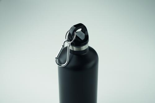 Double wall vacuum insulating bottle in recycled stainless steel (90% recycled stainless steel and 10% stainless steel) with carabiner handle lid. The carabiner is not for climbing (non-professional use). Leak-free. Capacity: 500 ml.